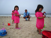 Sophia loved dipping her feet in the beach waves. The water was freezing cold to me, but it didn't seem to bother her. Hannah loved playing in the sand, filling her bucket with sand and dumping it out 5 feet elsewhere. Then, she would repeat that again and again. Alexandra enjoyed sunbathing and relaxing by the ocean breeze. Noah was a trooper. He really enjoyed his first beach experience and had lots to look at, especially his sisters running around and exploring.